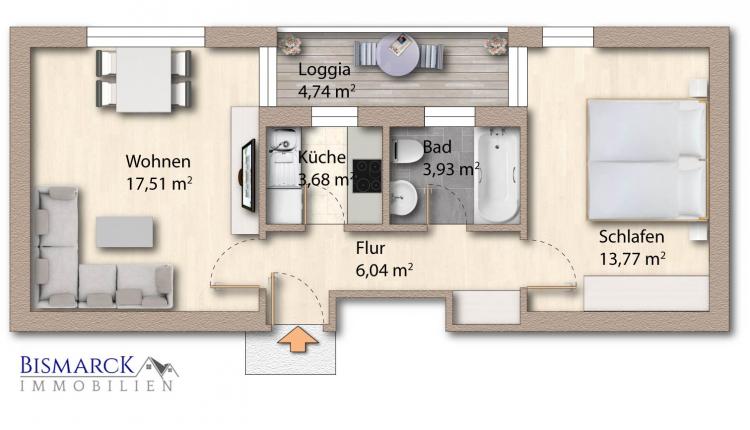 Die ca. 48 m² große Wohnung ist über das Treppenhaus oder den Aufzug bequem zu erreichen.