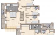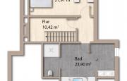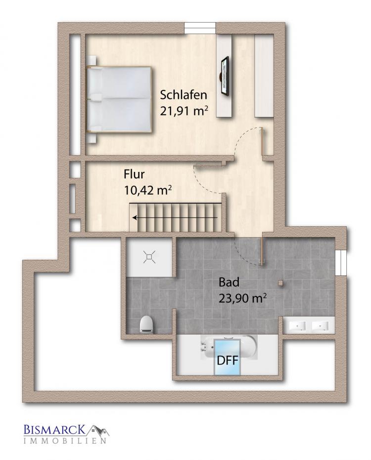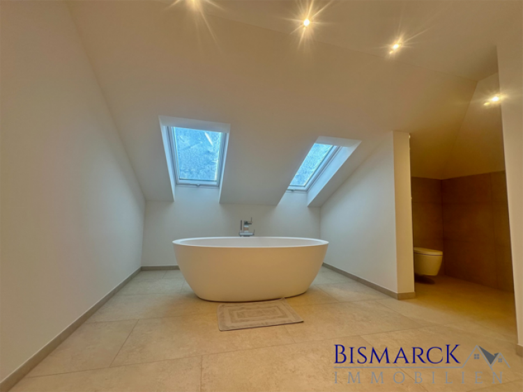 Im Dachgeschoss, welches komplett neu ausgebaut wurde, befinden sich ein Schlafzimmer, ein Badezimmer mit freistehender Badewanne, einer begehbaren Dusche sowie einer Toilette.