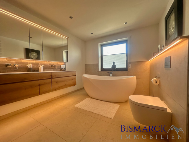 Eine Treppe bringt Sie ins erste Obergeschoss. Vier Schlafzimmer, welches das Elternschlafzimmer mit Ankleidezimmer einen extra Zugang zum Elternbad verfügt, befinden sich in dieser Etage. Das hochwertige Elternbad beinhaltet eine freistehende Badewanne, eine große begehbare Dusche, einer Toilette sowie zwei Waschtische.